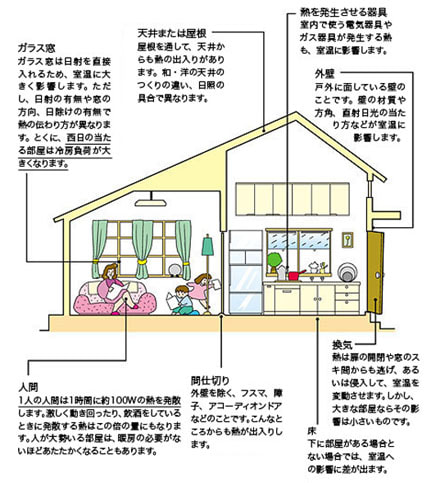 *:たとえば、暖房時にドアや窓にすきまがあると、空調された空気が室外に逃げ出すため、暖房負荷・冷房負荷が大きくなります。また、寒い地域は、一般的に暖房負荷が大きくなります。