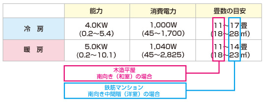 冷房では17畳まで、暖房14畳までの部屋に適しています。