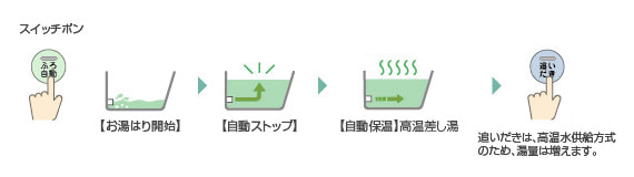 浴槽へ約80-90℃の高温差し湯ができて、追いだき感覚が得られます。