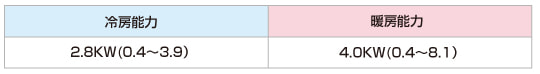 一般に、広い部屋で使う場合は「能力」の数値(kW)が大きいエアコン、狭い部屋で使う場合は「能力」の数値(kW)が小さいエアコンを選ぶとよいでしょう。