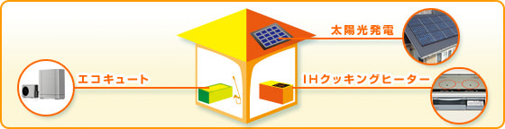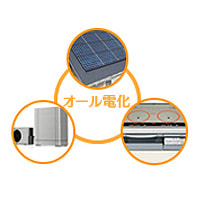 オール電化リフォームとは、「太陽光発電」 「IHクッキングヒーター」 「エコキュート」を用いて、照明、空調、 給湯、調理などの熱源を電気でまかなう住宅リフォームのことです。 また、余った電力は電力会社に売ることができたり、安い深夜電力が上手に使えたり、電力会社より10%の割引きが受けられるなど、 さまざまな経済的メリットも魅力です。