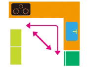 I型とは、シンク・コンロ台・調理台を横並びに配置するタイプです。作業がすべて横移動となるため、シンク・ガスコンロ台・調理台の位置関係(=順序)やスペース取りが大切になります。シンクや調理スペースが狭くならないように注意を払わないといけません。よくDKで採用される型で、シンク・冷蔵庫・ガス台または、IHヒーターを一直線に並べた最も基本的な配置です。全体の長さが長すぎると横歩き作業の連続となるので、疲れやすい型です。